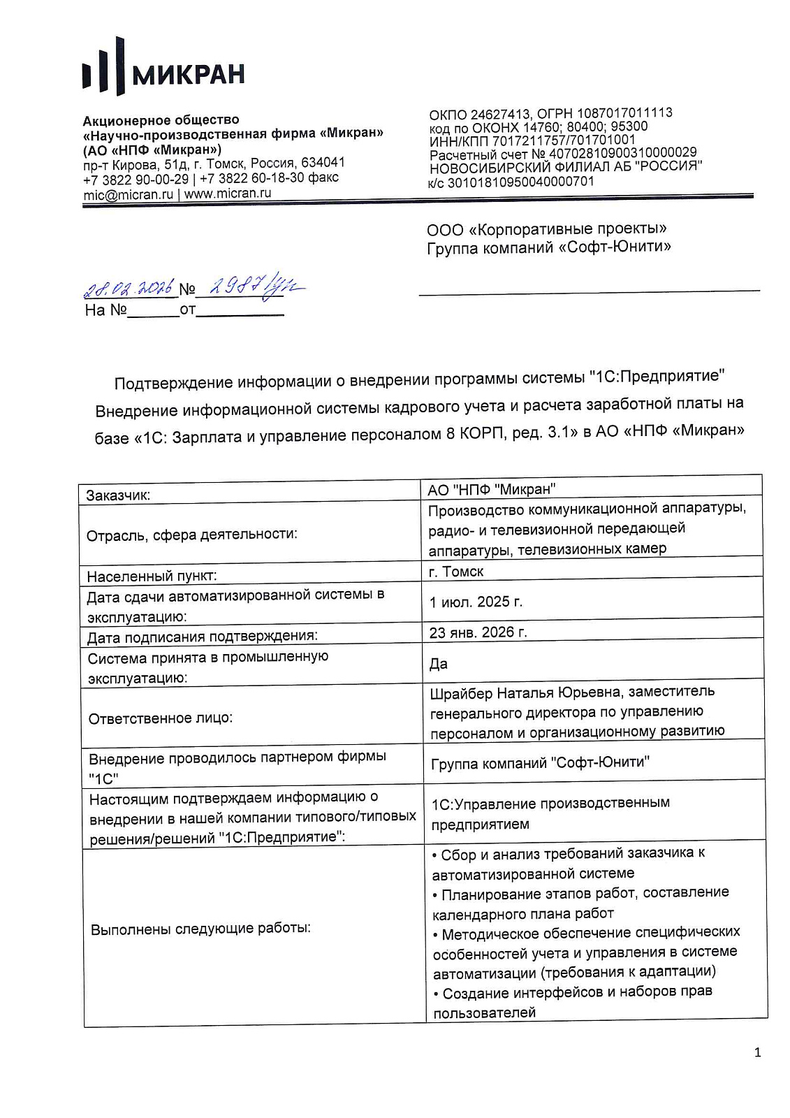 В апреле 2025 года в АО «НПФ «Микран» стартовал проект по внедрению информационной системы кадрового учета и расчета заработной платы на базе «1С: Зарплата и управление персоналом 8 КОРП, ред. 3.1», предназначенной для автоматизации комплекса операций, связанных с расчётом заработной платы, управлением персоналом, охраной труда организации и ведением кадрового делопроизводства. Для выполнения проекта в сжатые сроки было принято решение по автоматизации на базе более простого решения: «1С: Зарплата и управление персоналом 8 КОРП». Она позволила заменить устаревшую систему кадрового учета и расчета заработной платы. Общее количество пользователей в системе – 100 человек. С июля 2025 года система кадрового учета и расчета заработной платы на базе «1С: Зарплата и управление персоналом 8 КОРП, ред. 3.1» запущена в промышленную эксплуатацию. С учетом внешних обстоятельств, коммуникация с заказчиком происходила полностью в удаленном формате, но несмотря на это, работы по настройке, адаптации и модификации Системы на базе 1С: Предприятие были выполнены качественно и достигли поставленных целей в установленный заказчиком срок.Результаты проекта